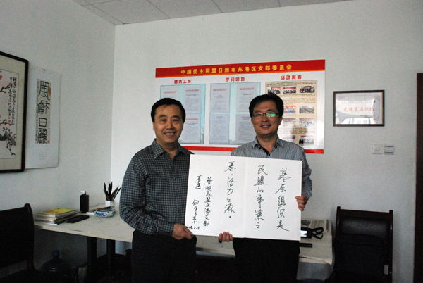 隨后調(diào)研組又來到民盟日照市東港區(qū)支部。儀平策向東港區(qū)政協(xié)副主席、中共區(qū)委統(tǒng)戰(zhàn)部部長沈文武和副部長邱志剛詳細了解基層組織黨盟之間的聯(lián)系情況,聽取了支部主委秦偉的盟務(wù)工作介紹。儀平策副主委指出,民盟東港區(qū)支部作為日照民盟最年輕的基層組織,各項盟務(wù)工作成績突出,開展的社會服務(wù)活動,參與成員多,活動內(nèi)容豐富,社會影響面廣,特別是活動緊密結(jié)合中共東港區(qū)委中心工作,積極爭取統(tǒng)戰(zhàn)部門的支持和參與,體現(xiàn)了良好的黨盟關(guān)系。聽取介紹后,儀平策欣然為民盟東港區(qū)支部題寫“基層組織是民盟的事業(yè)之基、活力之源”。