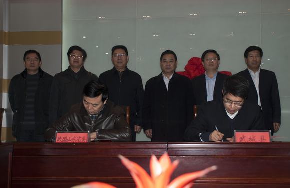 民盟省委副主委儀平策與中共武城縣委副書記、縣長王勝強代表雙方簽訂協(xié)議書