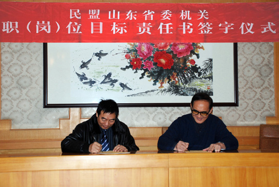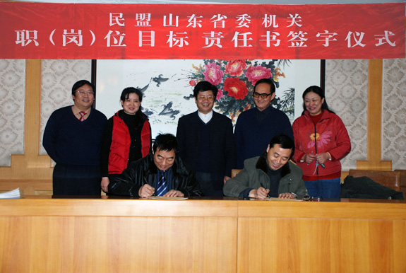 在簽字儀式上,儀平策副主委做了重要講話,對機關(guān)工作人員提出了四點希望。他說,第一,希望每位機關(guān)工作人員在新的一年里都能取得進步,政治素質(zhì)和業(yè)務素質(zhì)能夠得到提高,這只有通過堅持不懈地學習,做到與時俱進;第二,希望民盟組織的發(fā)展能夠再上一層樓,特別是要做好組織發(fā)展,廣泛網(wǎng)羅人才,提高民盟組織的整體素質(zhì);第三,希望山東民盟的影響能夠更大一點,提高民盟影響力的基礎(chǔ)是做好民盟的各項工作,做出成績,因此要進一步加大參政議政、社會服務工作和宣傳工作的力度,樹立精品意識,做精做好民盟工作;第四,希望民盟機關(guān)的氣氛能夠更融洽一些,人際關(guān)系更加和諧,機關(guān)的每一位同志都能夠擁有更健康的體魄和更平和的心態(tài),從而在工作中形成合力,順利完成民盟的各項工作。