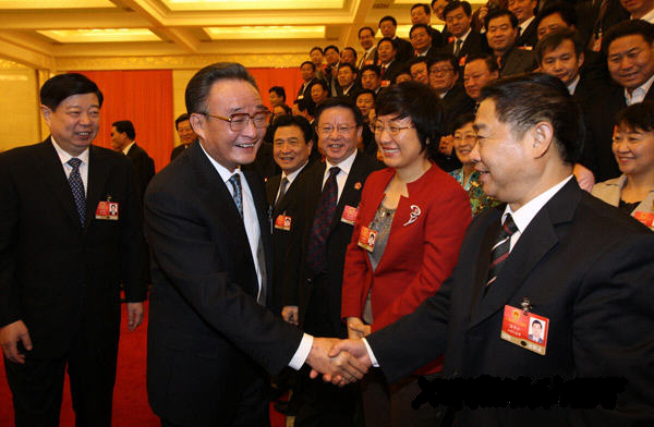 3月7日,中共中央政治局常委、全國人大常委會委員長吳邦國參加十一屆全國人大二次會議山東代表團(tuán)的審議時,與全國人大常委溫孚江親切握手。新華社記者 姚大偉 攝