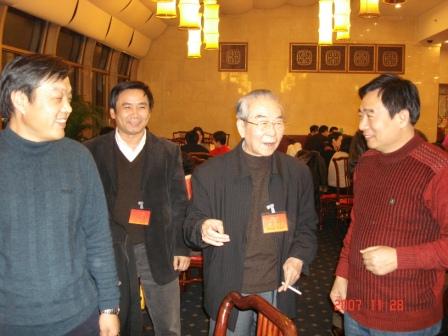 民盟山東省委主委溫孚江、專職副主委儀平策與原民盟中央副主席孔令仁討論工作報(bào)告