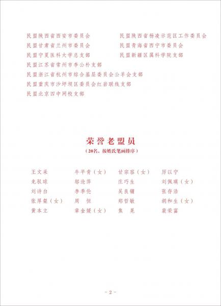 為表彰先進,弘揚優(yōu)良傳統(tǒng),激發(fā)廣大盟員干事創(chuàng)業(yè)的責(zé)任感使命感,匯聚不斷奮進的磅礴力量,民盟中央決定,授予民盟清華大學(xué)委員會等50個市級委員會和基層組織“先進集體”榮譽稱號,授予王文采等20名同志“榮譽老盟員”榮譽稱號、萬捷等100名同志“杰出盟員”榮譽稱號、丁邦晗等100名同志“優(yōu)秀盟員”榮譽稱號(名單附后)。希望被表彰的集體和個人,珍惜榮譽、發(fā)揚成績、開拓進取、再立新功。