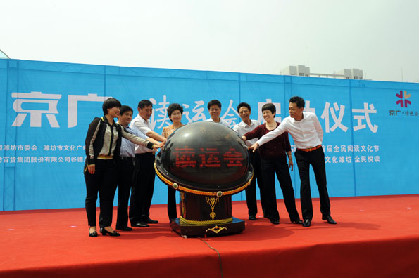 6月1日,由民盟濰坊市委、中共濰坊市委宣傳部、濰坊市文化廣電新聞出版局、濰坊市文化市場綜合執(zhí)法局主辦,山東京廣傳媒股份有限公司、濰坊廣播電視報、山東濰坊百貨集團股份有限公司谷德廣場承辦的2013京廣·讀運會啟動儀式在濰坊谷德廣場開幕。濰坊市人大常委會副主任、民盟濰坊市委主委毛秀鳳,中共市委宣傳部常務副部長丁漢邦等領導出席了此次活動。