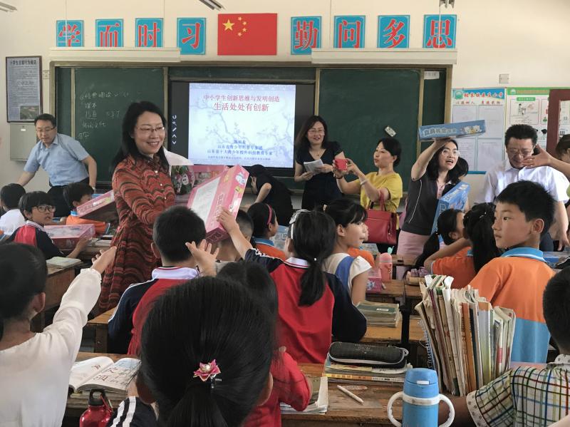 此次活動特邀盟員山東省發(fā)明協(xié)會副秘書長陳明泉教授為孩子們帶去了一堂“生活處處有發(fā)明”的發(fā)明創(chuàng)新啟迪課程。課程一開始孩子們就被陳教授精美的圖片、風(fēng)趣幽默的語言所吸引。課堂上不時發(fā)出“哇”“咦”這樣的驚嘆聲。陳教授從衣食住行玩等生活的方方面面啟發(fā)孩子們發(fā)現(xiàn)生活中的創(chuàng)新點(diǎn),開拓創(chuàng)新性思維。孩子們?nèi)瘫魂惤淌诘木恃葜v所吸引。課后紛紛表示要做生活中的小發(fā)明家。