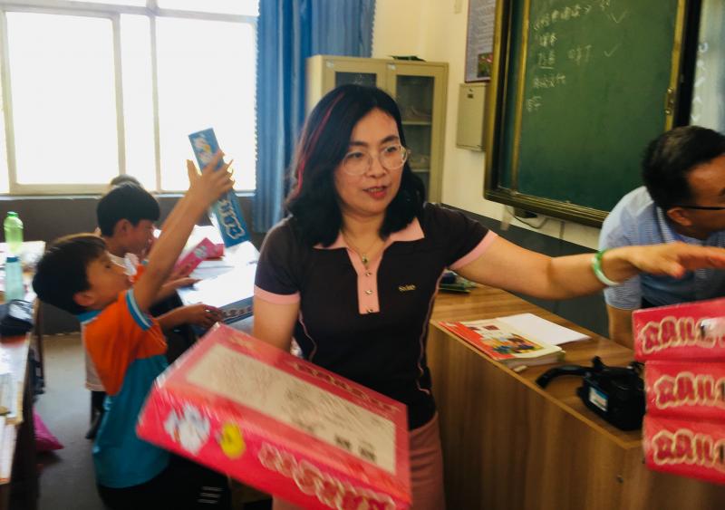 民盟山東省委女盟員委員會主任、濟(jì)南市槐蔭區(qū)人大副主任印東在給孩子們發(fā)放學(xué)習(xí)用品
