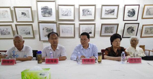 劉吉忠與民盟市委原主委喬玉蘭為民盟市委會“盟員之家”劉吉忠與民盟市委原主委湯海涵為“棗莊民盟書畫院創(chuàng)作基地”揭牌。民盟棗莊書畫院院長徐隆引導(dǎo)與會人員參觀了“盟員之家”暨“創(chuàng)作基地”。