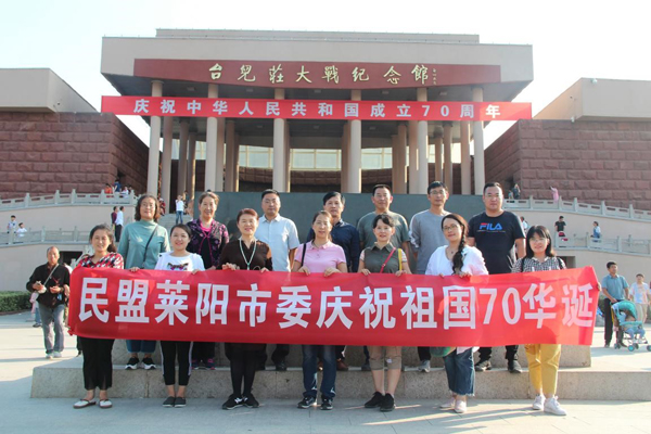 2019年10月1日,民盟萊陽(yáng)市委組織部分盟員代表赴棗莊市臺(tái)兒莊大戰(zhàn)紀(jì)念館參觀學(xué)習(xí),舉行了一場(chǎng)追憶革命歷史,緬懷革命先烈,激發(fā)愛國(guó)主義熱情的紅色教育活動(dòng),以此慶祝中華人民共和國(guó)成立70周年。民盟萊陽(yáng)市委主委劉愛玲、原主委劉健美,副主委劉克浩、戰(zhàn)文吉,組織委員徐旭波等共14位盟員代表參加了活動(dòng)。
