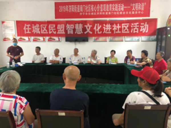 2020年8月7日,民盟濟(jì)寧市任城區(qū)二支部智慧文化進(jìn)社區(qū)活動(dòng)在民盟濟(jì)寧市委社區(qū)服務(wù)工作站——任城區(qū)濟(jì)陽街道南門社區(qū)舉行。民盟濟(jì)寧市委委員、民盟任城區(qū)二支部主委王平,副主委周鳳,任城區(qū)二支部部分盟員及南門社區(qū)30位老年人共同參與活動(dòng)。