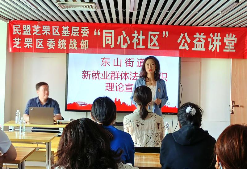 6月13日,民盟煙臺芝罘區(qū)基層委聯(lián)合中共芝罘區(qū)統(tǒng)戰(zhàn)部,在東山街道舉辦“同心社區(qū)”法律知識公益大講堂。中共芝罘區(qū)統(tǒng)戰(zhàn)部副部長于冬育、民盟煙臺芝罘區(qū)基層委副主委于寧、東山街道辦事處工作人員及轄區(qū)企業(yè)負(fù)責(zé)人參加活動。