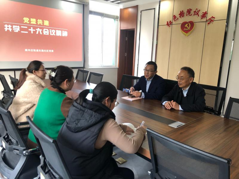 11月11日,民盟省直科技綜合總支文化科技支部走進(jìn)槐蔭區(qū)南辛莊東路社區(qū),與社區(qū)黨支部共同學(xué)習(xí)中共二十大精神,交流學(xué)習(xí)會(huì)議精神心得體會(huì)。南辛莊東路社區(qū)主任王曉峰、民盟山東省直科技總支支部主委翟樹剛、文化科技支部主委王強(qiáng)參加會(huì)議。