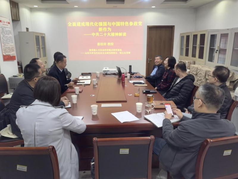 掛牌儀式后,教育部人文社會(huì)科學(xué)重點(diǎn)研究基地山東大學(xué)當(dāng)代社會(huì)主義研究所所長、博士生導(dǎo)師崔桂田教授作了“全面建成現(xiàn)代化強(qiáng)國與中國特色參政黨新作為”報(bào)告。崔桂田教授從黨的二十大的里程碑意義、對(duì)中國特色社會(huì)主義參政黨提出的新要求以及現(xiàn)代化強(qiáng)國建設(shè)和中國特色社會(huì)主義參政黨能力提升等方面進(jìn)行專題輔導(dǎo),引發(fā)盟員和編輯部老師們的熱烈反響,讓大家經(jīng)受了一次強(qiáng)烈的精神洗禮,進(jìn)一步堅(jiān)定了理想信念,切實(shí)增強(qiáng)了同心同德團(tuán)結(jié)合作、共同奮斗現(xiàn)代化的精氣神,深化了盟員和編輯黨員老師對(duì)自身使命擔(dān)當(dāng)?shù)恼J(rèn)識(shí),奏響了新時(shí)代多黨合作同心共建中國式現(xiàn)代化強(qiáng)國的號(hào)角。