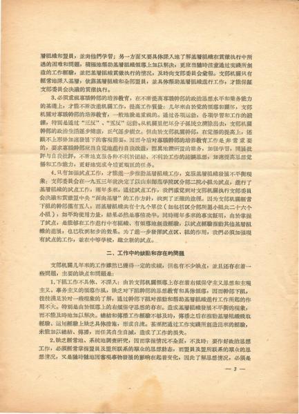 姜子修在《關(guān)于支部機(jī)關(guān)工作的幾點(diǎn)體會(huì)》中詳細(xì)的講了“幾年來(lái)的工作概況和收獲”,從中我們可以看到民盟基層組織在新中國(guó)成立后,在中國(guó)共產(chǎn)黨的領(lǐng)導(dǎo)下,參加人民政權(quán)和人民政協(xié)的工作,為鞏固人民民主專(zhuān)政、發(fā)展愛(ài)國(guó)統(tǒng)一戰(zhàn)線、順利實(shí)現(xiàn)社會(huì)主義改造和促進(jìn)社會(huì)主義事業(yè)的發(fā)展,發(fā)揮了積極的作用。資料中提到了積極參與“三反、五反、參加文教建設(shè)、共同綱領(lǐng)學(xué)習(xí)、總路線學(xué)習(xí)、憲法學(xué)習(xí)”等運(yùn)動(dòng),積極貫徹盟中央“面向基層、面向業(yè)務(wù)”的工作方針,努力提高盟員思想覺(jué)悟。