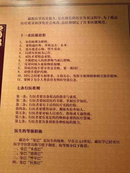 藏醫(yī)在藏族同胞中有著極高的榮譽(yù)和地位,除了學(xué)習(xí)醫(yī)典外還要有同情心、利他心、慈悲心,遵守八條醫(yī)德。有一張圖片展示了藏醫(yī)藥的醫(yī)療規(guī)范,包括“需具慈悲心腸,惜生愛命”、“對防病治病不要分貧富貴賤,要一視同仁”、“反對向病人索取物質(zhì)報酬”、“同行之間要互相尊重、互相關(guān)心、互相協(xié)作”等。唐代名醫(yī)孫思邈在《大醫(yī)精誠》里所說“凡大醫(yī)治病,必當(dāng)安神定志,無欲無求,先發(fā)大慈惻隱之心……不得問其貴賤妍媸,怨親善友,華夷愚智,普同一等……見彼苦惱,若己有之”。與現(xiàn)代醫(yī)學(xué)非常重視的“人文是醫(yī)生的靈魂”、“做有溫度的醫(yī)生”、“技術(shù)使力量,良知是方向”、“道德常常能填補(bǔ)智慧的缺陷,而智慧卻永遠(yuǎn)填補(bǔ)不了道德的缺陷”等是一致的。傳統(tǒng)醫(yī)學(xué)與現(xiàn)代醫(yī)學(xué),對從業(yè)者,在醫(yī)德醫(yī)風(fēng)方面的要求是沒有區(qū)別的。